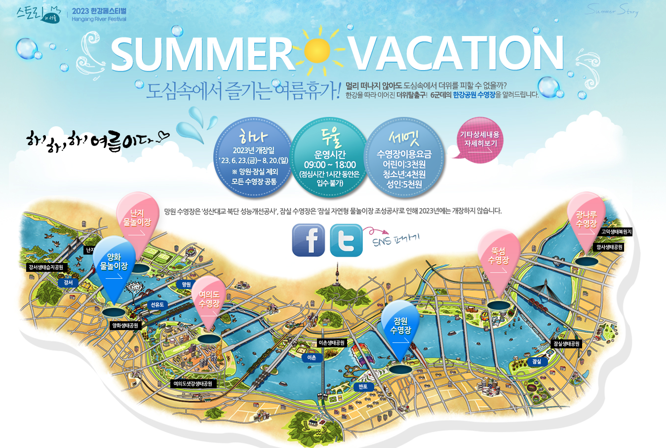 한강 수영장은 한강을 따라 광나루, 뚝섬, 여의도, 잠원에 수영장을, 난지와 양화에는 물놀이장을