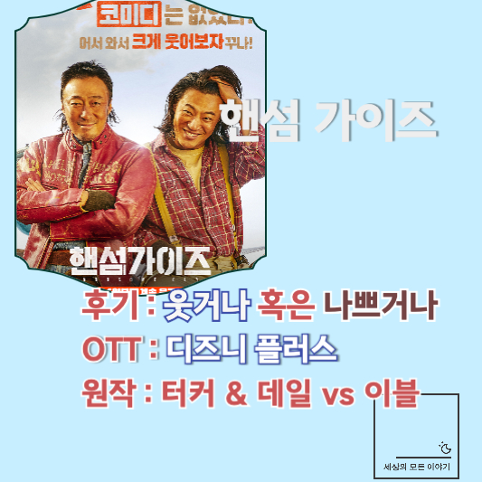 이상 디즈니 플러스 영화 '핸섬 가이즈' 간단한 후기와 OTT, 원작 정보 정리해 드렸습니다. 그냥 생각을 덜어 놓고 웃고 싶은 날 한번 감상해보시길 추천합니다. 감사합니다.
