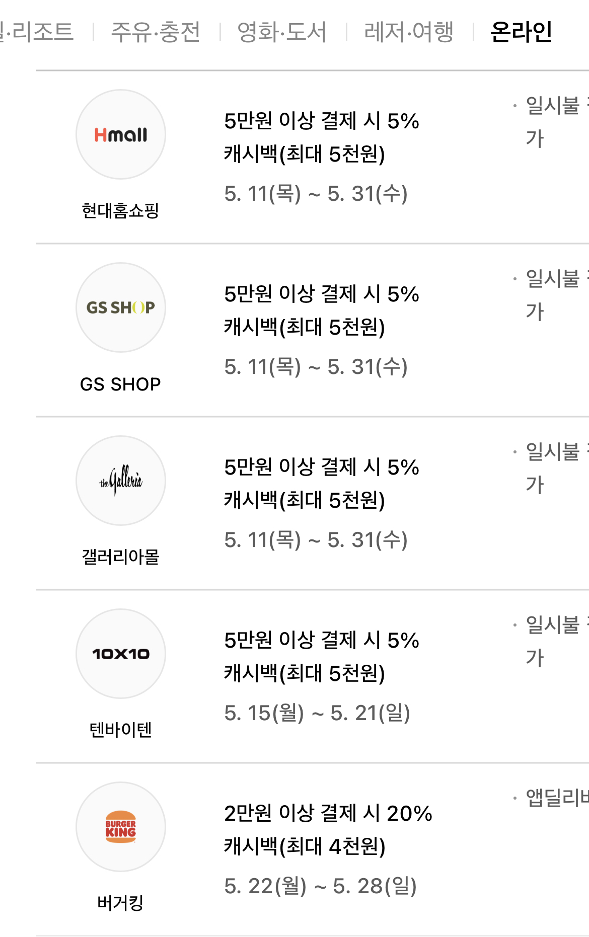 온라인에서도 현대 홈쇼핑 GS숍 등 5% 캐시백(최대 5천원) 받으실 수 있습니다.