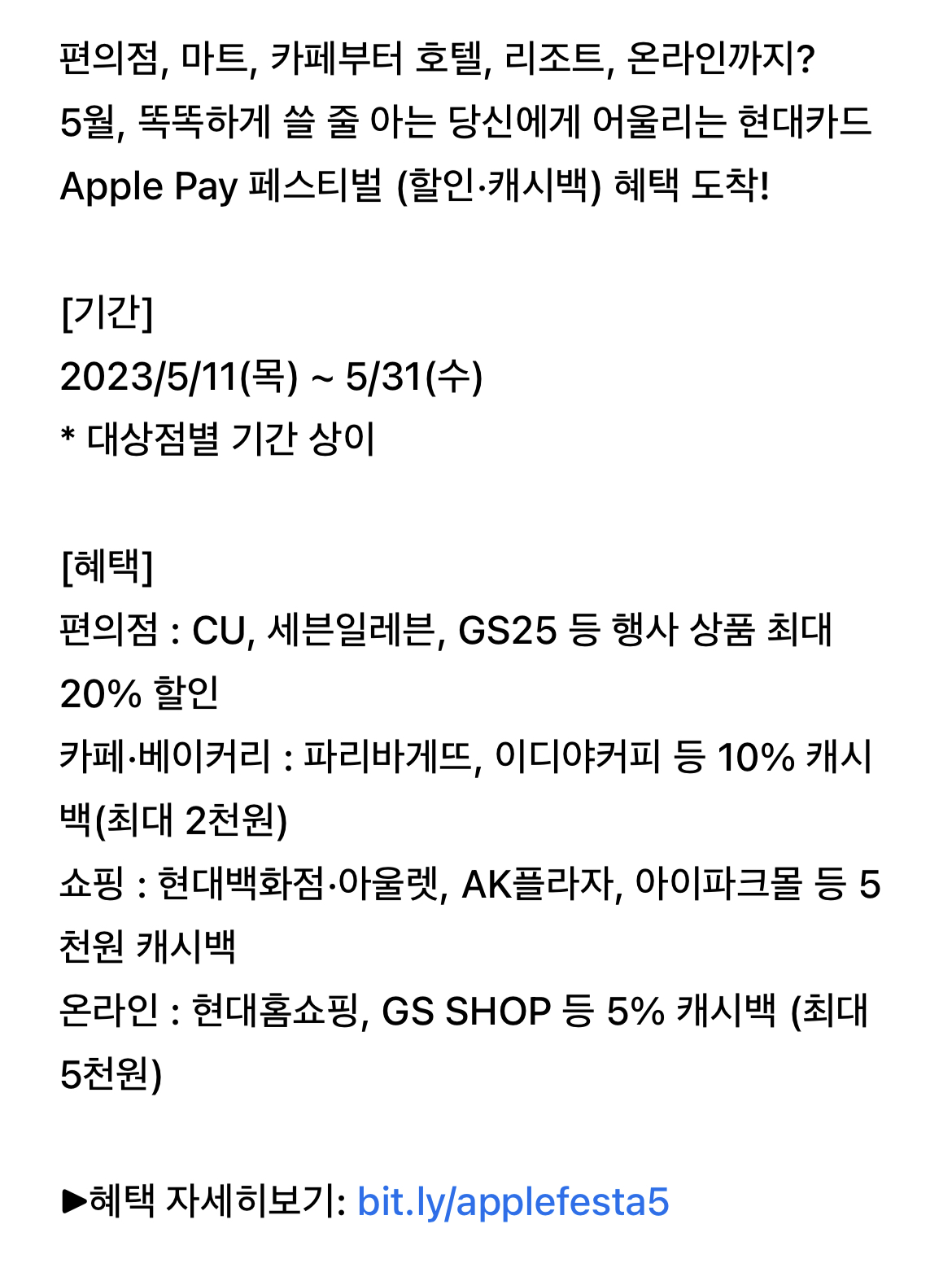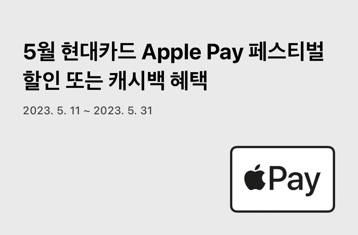 이상 현대카드 애플페이 할인 및 캐시백 이벤트를 간단 정리해보았습니다.