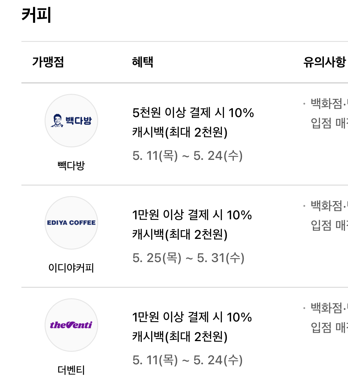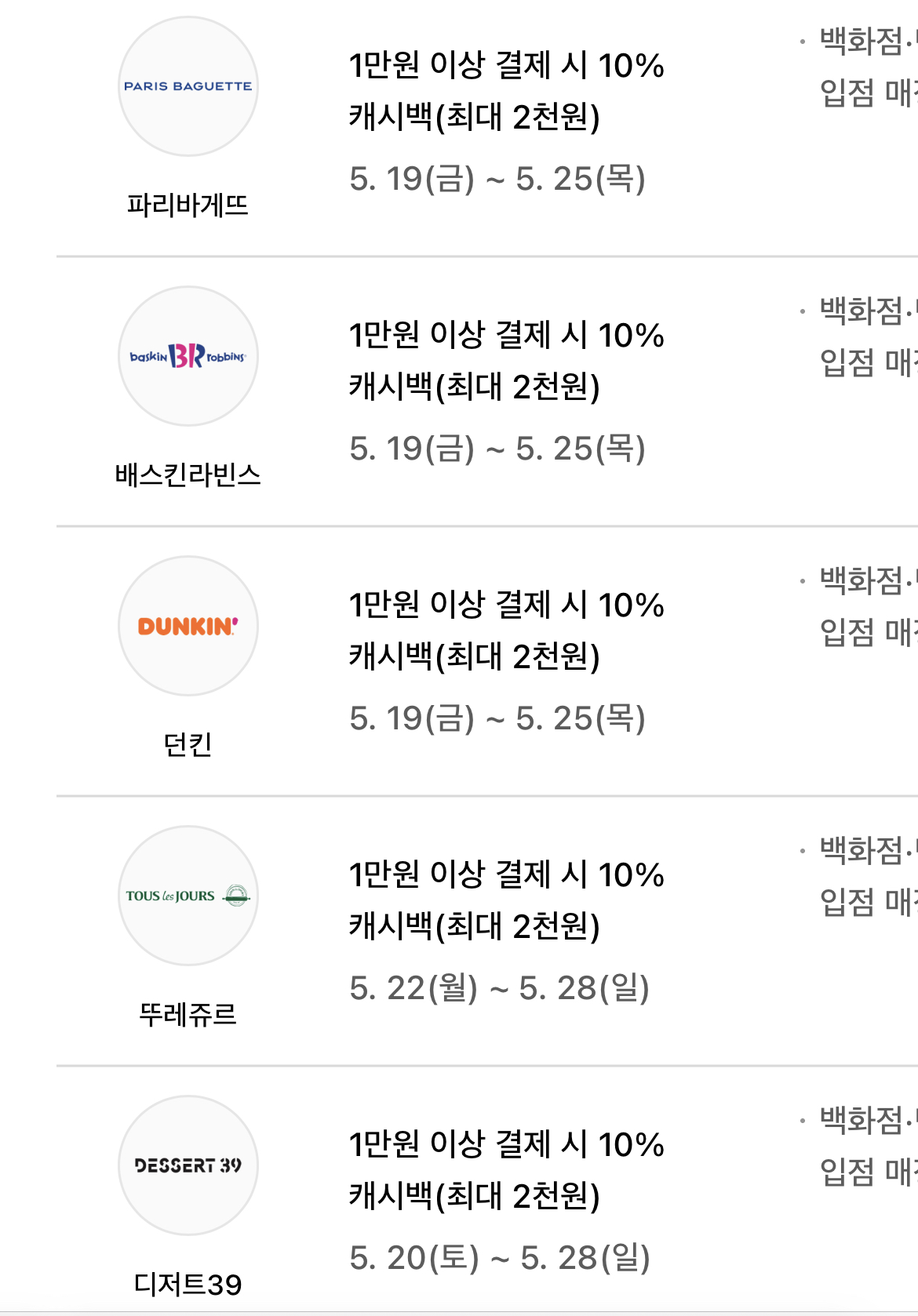 베이커리 카페는 파리바게뜨, 이디야커피 등 10% 캐시백(최대 2천원) 적립 받으실 수 있습니다.