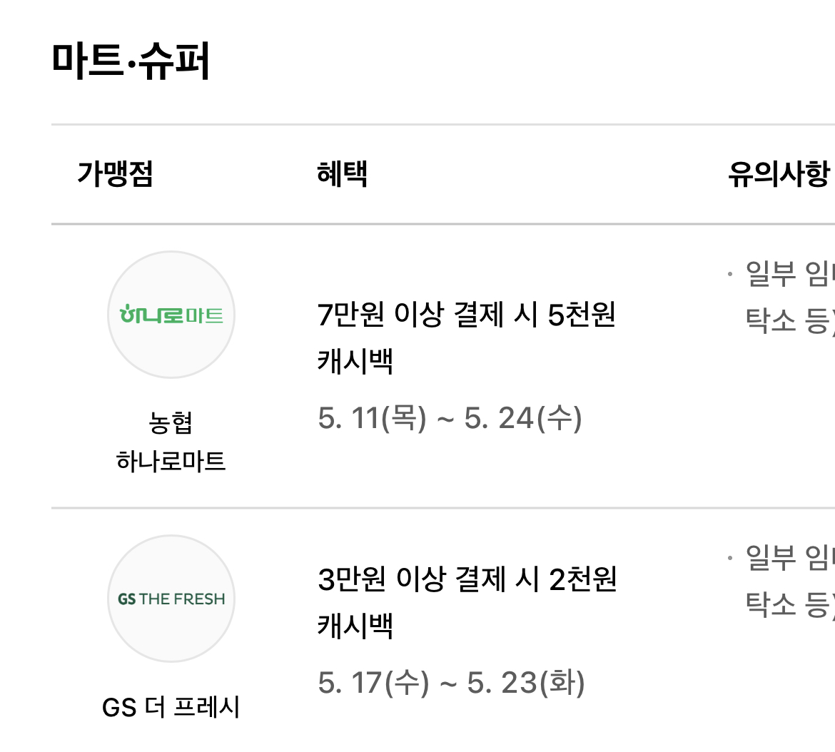 농협 하나로 마트 GS 더 프레시 등에서 주로 캐시백 이벤트가 진행됩니다.