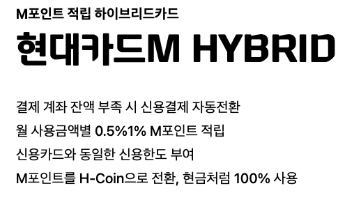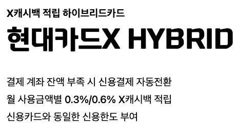 체크카드는 당연히 계좌 잔액 안에서 결제됩니다. 그런데 하이브리드는 계좌 잔액이 없는 경우에는 신용 결제로 전환되는 카드라 사용에 더 편리함이 있습니다. 각각 M 하이브리드와 X 하이브리드 카드가 있습니다.