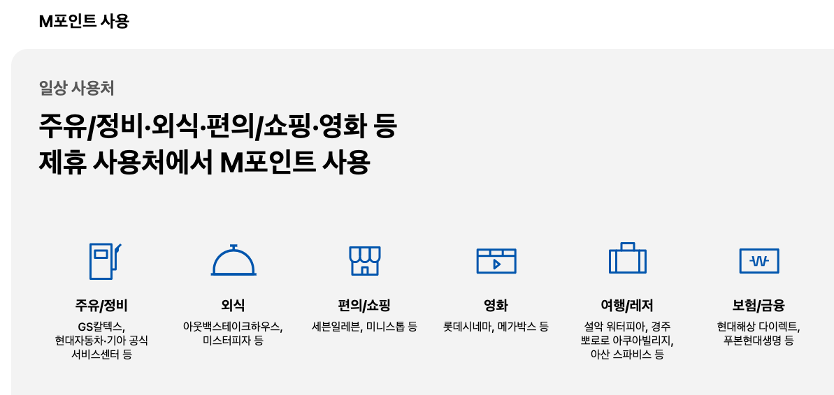 M포인트의 사용처는 주유, 정비, 외식, 편의 쇼핑, 영화 등 다양한 곳에서 사용하실 수 있습니다. 또 M포인트몰도 따로 있어서 별도 쇼핑도 가능합니다.