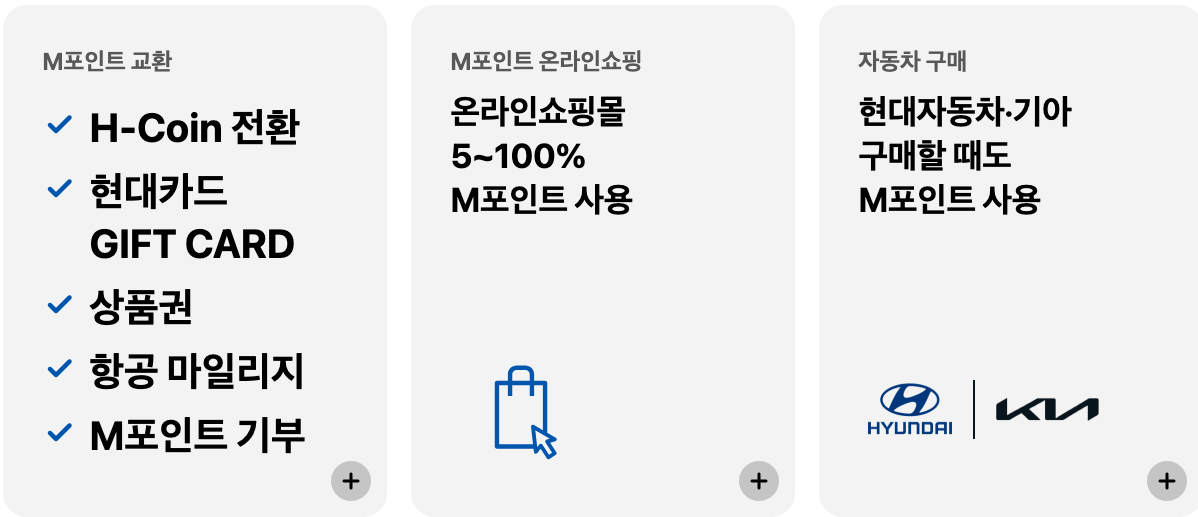 M 포인트를 현대백화점에서 사용할 수 있는 H-Coin으로 전환하여 현금처럼 사용할 수도 있습니다. 그 외에도 다양한 업종에서 M 포인트를 현금처럼 사용할 수 도 있습니다.