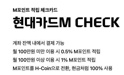 현대카드 M 체크 카드는 계좌 잔액 내에서 결제 가능하시며 사용 금액에 따라 M포인트를 적립해주는 카드입니다. 월 100만원 이상 사용하시면 1%, 100만원 미만은 0.5%의 M포인트를 적립해줍니다.