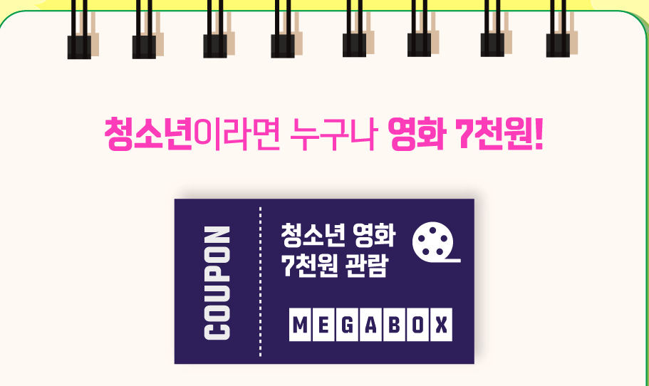 이 기간 메가박스에서 청소년이라면 누구나 영화를 7,000원에 볼 수 있습니다. 청소년이 아닌 수험생도 수험표 인증하면 동일한 혜택 누릴 수 있습니다. 만약 메가 박스를 처음 이용하는 거라면 웰컴 쿠폰팩을 받을 수 있습니다.
