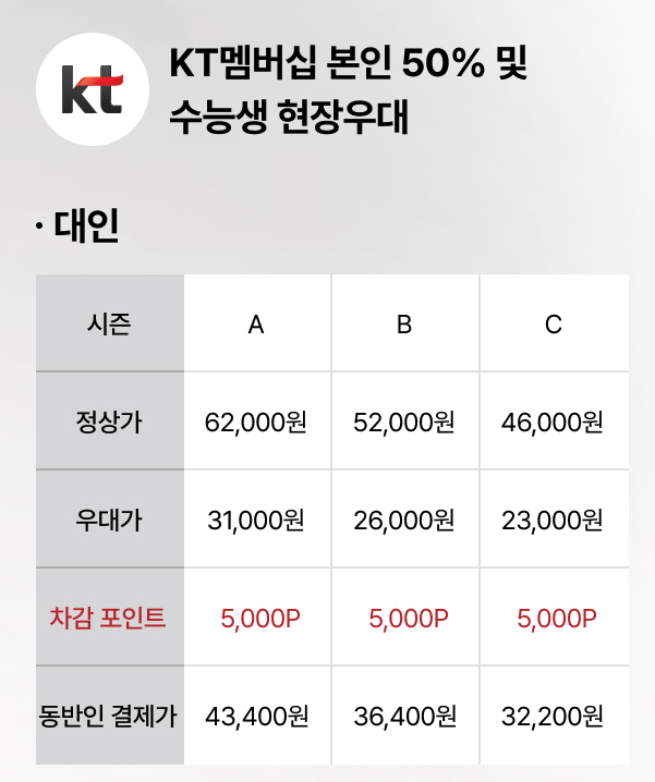 KT멤버십 할인은 대인의 경우 멤버십 포인트 5000P 차감 후 50% 할인된 가격인 평일 26,000원(B시즌 기준), 주말 31,000원(A시즌 기준)에 에버랜드 이용하실 수 있습니다. 동반인은 36,400원(평일), 43,400원(주말)로 역시 할인된 가격으로 함께 할 수 있습니다.