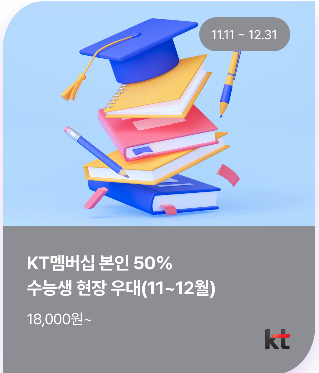 올해 수능을 본 수험생은 더 큰 혜택이 있습니다. KT 멤버십을 이용하는 수험생은 수험생 증빙서류 지참하여 증빙하면 멤버십 포인트 5000P 차감한 후 시즌에 상관없이 종일권을 19,000원에 구매 이용하실 수 있습니다.