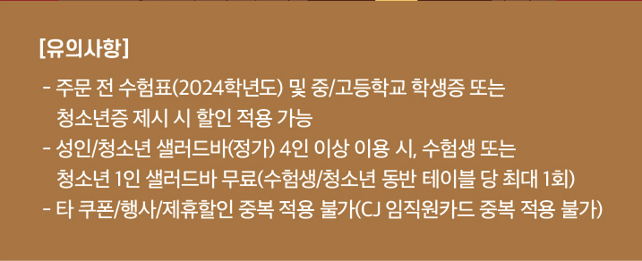 자신의 모든 것을 수능에서 하얗게 불태운 수험생들. 맛있는 음식으로 에너지를 보충할 때입니다. 일부 외식 업체에서는 수험생 이벤트를 진행하고 있으니 확인 하시고 혜택 누리시기 바랍니다.