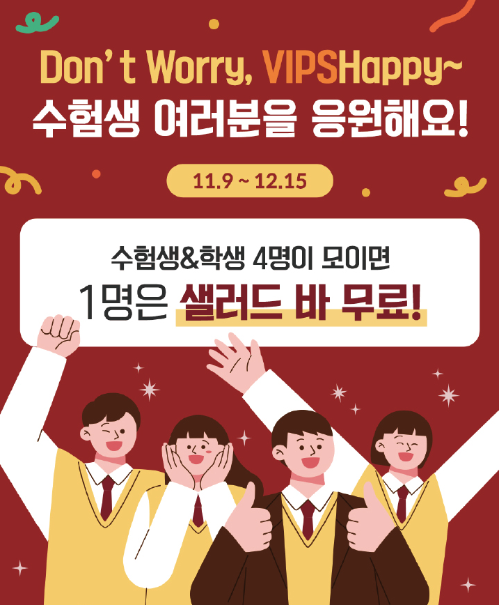 빕스에서도 수험생을 위한 할인 혜택이 있습니다. 수험생을 포함한 학생 4명이 빕스를 이용하면 그 중 한 명은 샐러드 바를 무료로 이용하게 해주는 이벤트입니다. 기간은 11월 9일부터 12월 15일까지고, 주문 전에 수험표, 학생증 혹은 청소년증을 제시 하면 할인 적용 받을 수 있습니다.