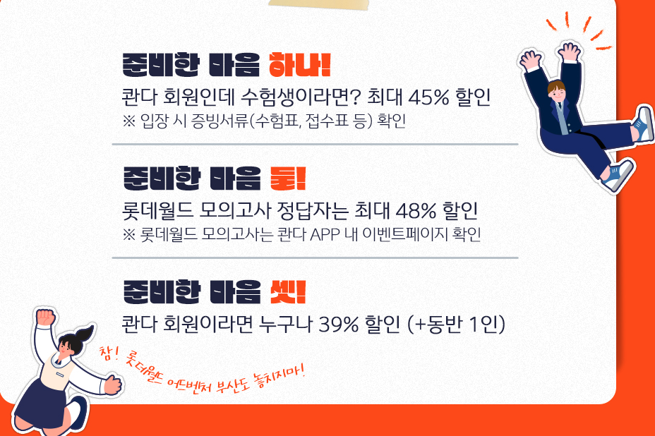 올 한 해, 수능만 바라보고 달려온 수험생들 모두 고생하셨습니다. 이제 수험표 들고 할인 혜택 누릴 시간입니다. 2024학년도 수능 시험 후 수험생들이 누릴 수 있는 할인 이벤트 정리해 드리겠습니다. 놀이공원 가고 외식하고 영화볼 때 수험표와 함께 혜택 누리시길 바랍니다.