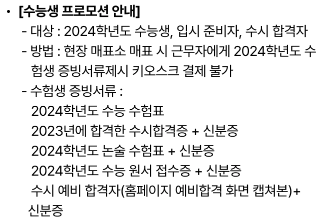 이상 2024학년도 수능 본 수험생들이 수능 시험 이후 누릴 수 있는 할인 혜택 정리해 보았습니다. 수능 후에 즐길 때 놓치지 말고 혜택 받고 즐기시길 바랍니다. 수험생 여러분 수고 많으셨습니다.