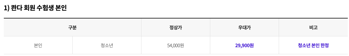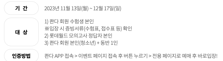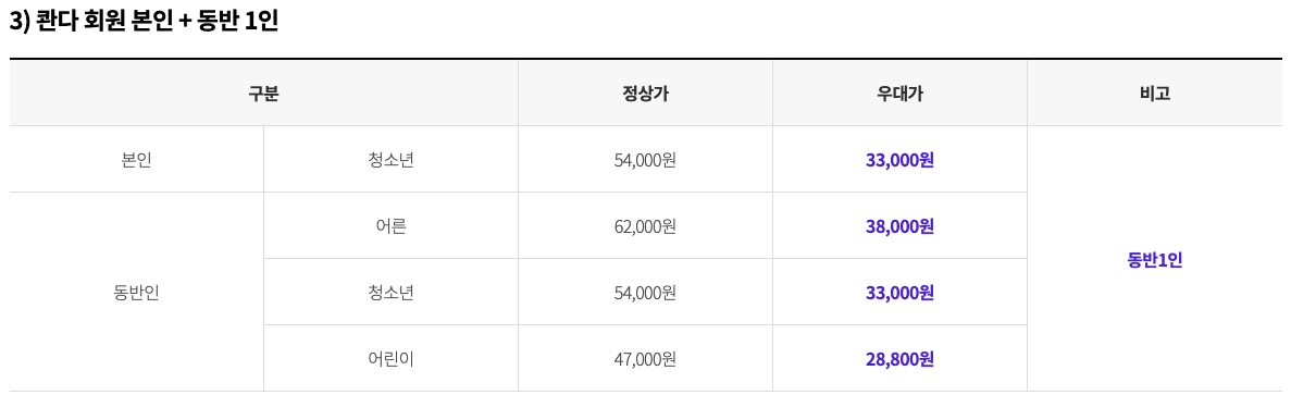 또 수험생이 아니더라도 청소년 콴다회원 본인과 동반 1인까지 할인 혜택이 있는데요 회원인 청소년 본인과 청소년 동반 1인은 33,000원에 함께 한 어른은 38,000원, 어린이는 28,800원에 즐길 수 있습니다.