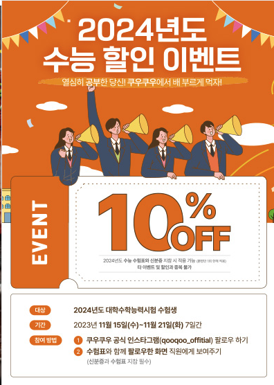 우선 스시, 롤로 유명한 쿠우쿠우에서는 11월 15일(수)부터 11월 21일(화)까지 일주일간 10%할인 이벤트를 진행합니다. 쿠우쿠우 공식 인스타그램을 팔로우 한 뒤, 팔로우한 화면과 수험표를 보여주면 수험생 본인에 한해서 할인 혜택을 주는 이벤트입니다.