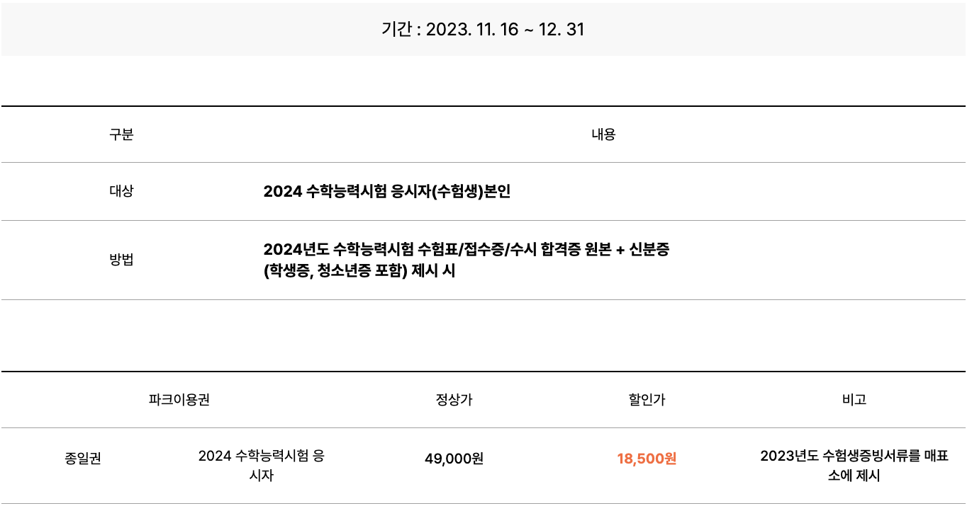2024학년도 수험표, 접수증, 수시 합격증 원본에 본인 신분증을 매표소에서 제시하면 정상가 49,000원을 18,500원에 이용할 수 있습니다. 놀이공원을 가고 싶은 수험생들은 놓치지 말고 누리셔야겠습니다.
