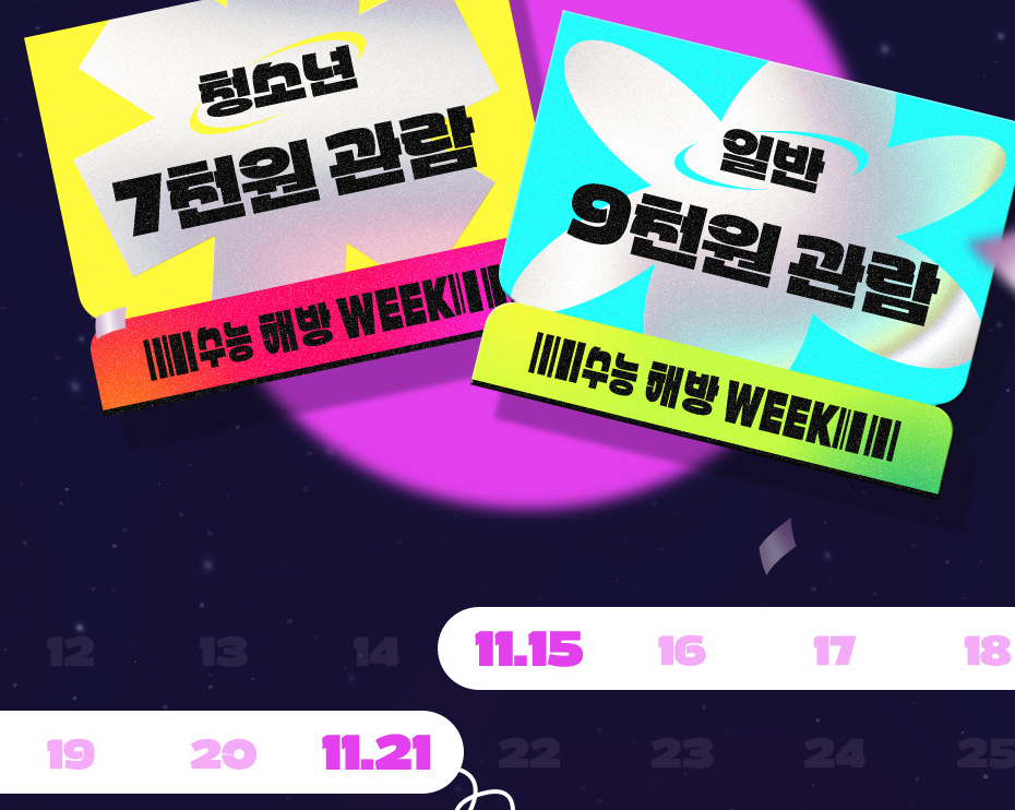우선 CGV에서는 수능 해방 위크라고 해서 11월 15일 ~ 11월 21일까지 청소년은 7천원에 일반은 9천원에 영화를 볼 수 있습니다.