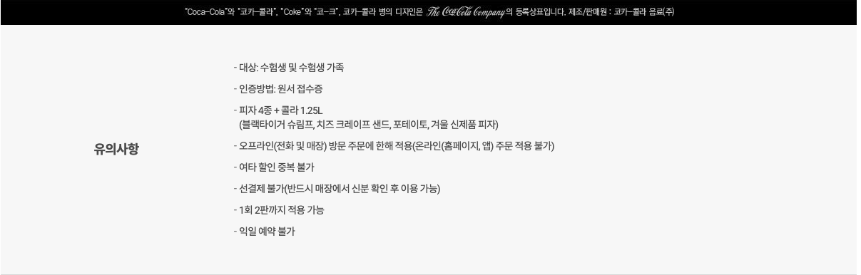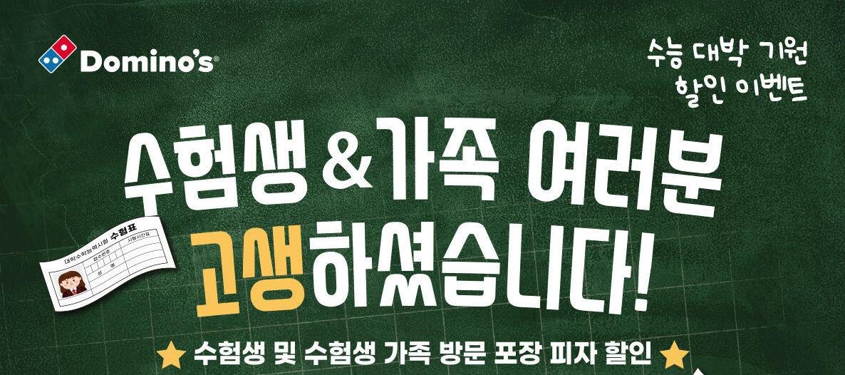 도미노 피자에서는 수험생 및 수험생 가족이 방문 포장할 경우 할인 혜택을 주는 이벤트를 진행합니다.