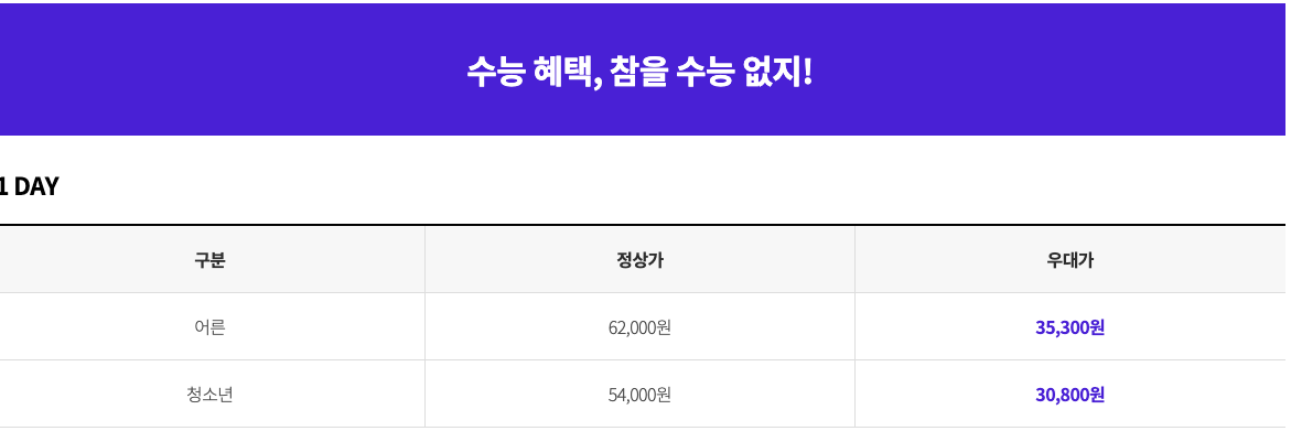 고3이나 N수생 모두 혜택을 받을 수 있습니다. 성인은 35,800원 청소년은 30,800원으로 종일권 구매하여 즐기실 수 있습니다.