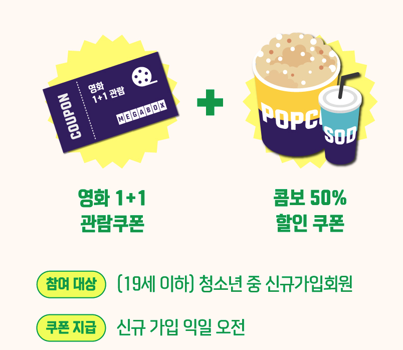 19세 이하 청소년 중 신규 가입 회원에게는 영화 1+1 관람 쿠폰과 콤포 50% 할인 쿠폰을 지급합니다.