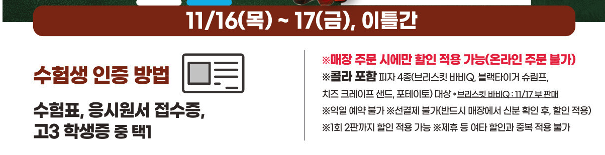 기간은 16일 17일 이틀간이고 수험표, 응시원서 접수증, 고3 학생증 중에서 하나로 인증 받으면 됩니다. 오직 매장 주문 시에만 혜택을 받을 수 있으니 이점 유의하셔야겠습니다. 할인 대상이 되는 피자도 4종으로 제한적이니 주문 시 확인하셔야 합니다.