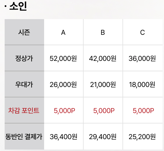 소인 역시 멤버십 포인트 5000P 차감하면 50% 할인된 가격에 이용할 수 있습니다. (평일 21,000 / 주말 26,000원) 동반 소인 역시(평일 29,400 / 주말 36,400원) 할인 받아 입장하실 수 있습니다.