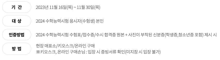 대상은 수험생 본인이고 인증방법은 수능 수험표 / 접수증 / 수시 합격증 원본에 본인을 확인할 수 있는 신분증(사진 부착)을 제시하면 됩니다. 현장 매표소 / 키오스크 / 온라인 구매 등으로 티켓 구매할 수 있고 입장 시 위 증빙 서류로 확인 받게 됩니다.