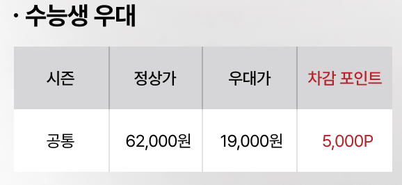 올해 수능을 본 수험생은 더 큰 혜택이 있습니다. KT 멤버십을 이용하는 수험생은 수험생 증빙서류 지참하여 증빙하면 멤버십 포인트 5000P 차감한 후 시즌에 상관없이 종일권을 19,000원에 구매 이용하실 수 있습니다.