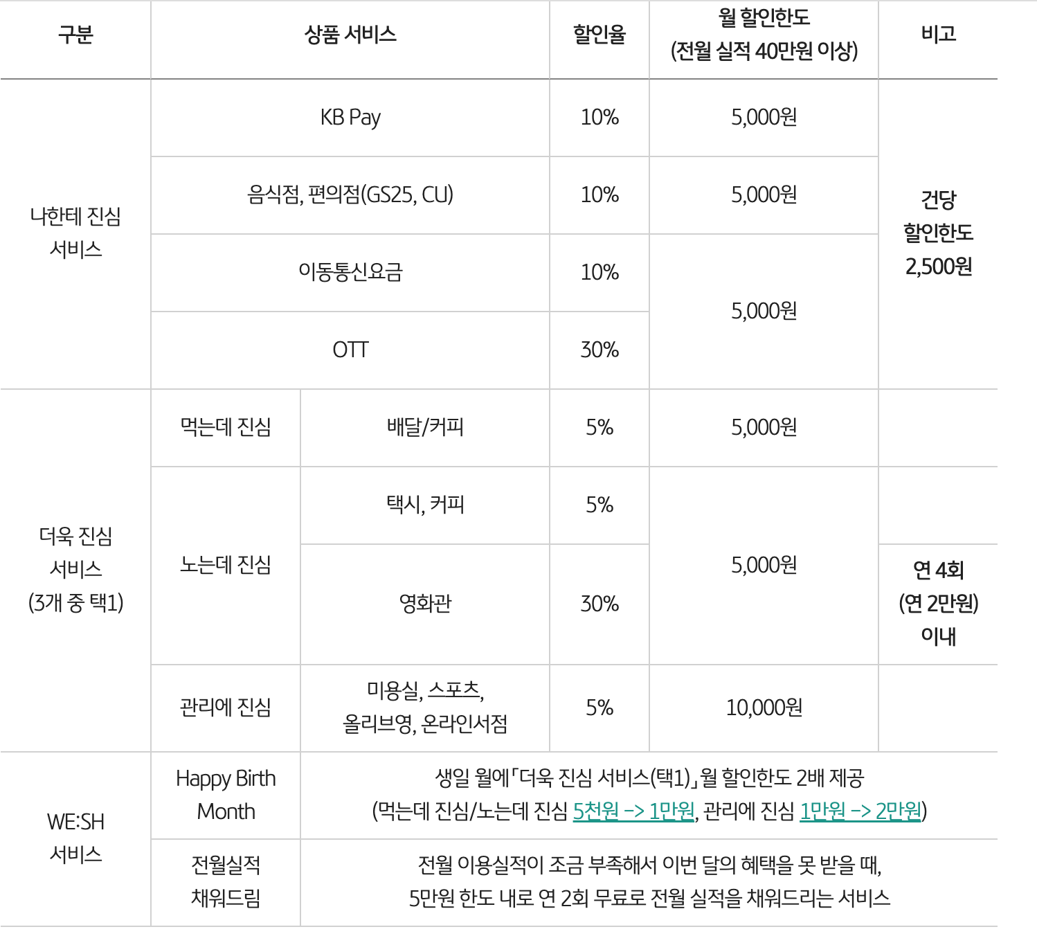 KBPay / 음식 / OTT 결제 시 10~30% 할인, 배달, 커피, 영화 미용실 등 5~30% 선택 할인이 있고 이 모든 혜택은 당연히 카드 실적(40만원 이상)에 따라 받을 수 있는데 실적이 조금 모자란 경우 전월 실적 채워드림 서비스도 있다고 합니다. (5만원 내로 연 2회 채워드림)