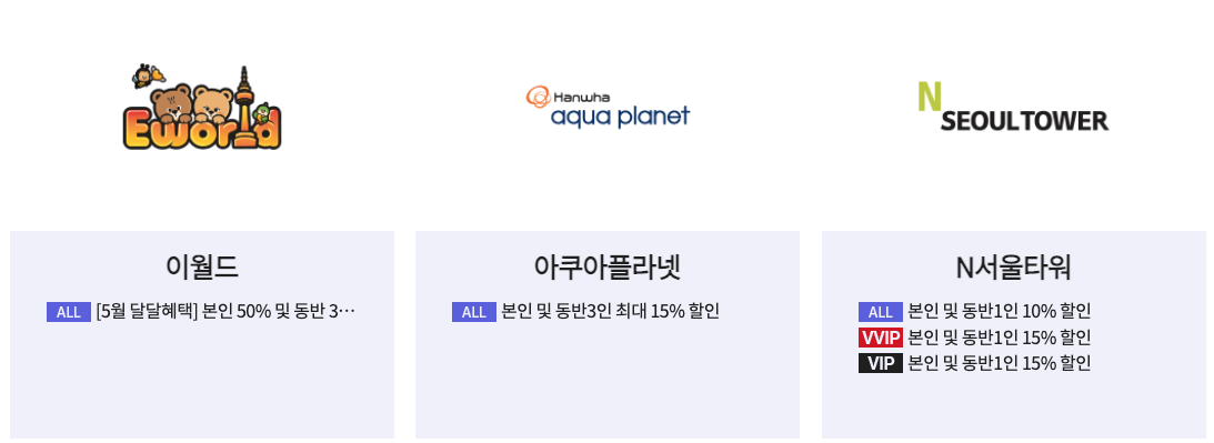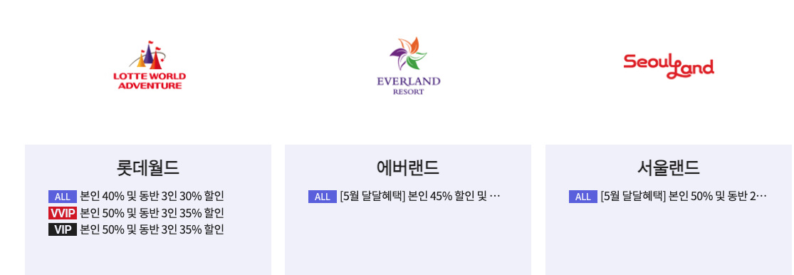 롯데월드의 경우 Vip 이상 등급은 본인 50% / 동반 3인 35% 할인이고