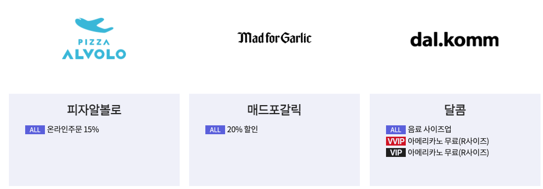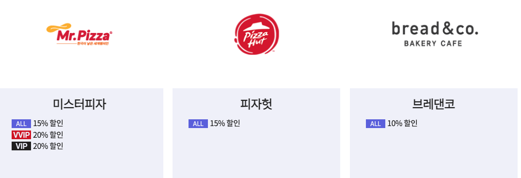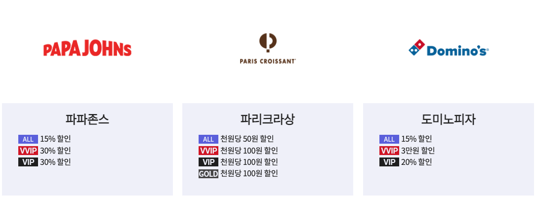 파파존스와 도미노 피자의 경우 모든 등급 15%할인 혜택이 있습니다.