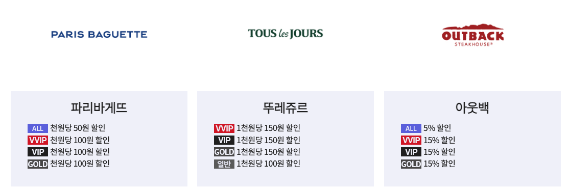 그 밖에 파리크라상 파리바케트 뚜레쥬르 같은 베이커리에서 할인 혜택 받을 수 있습니다.