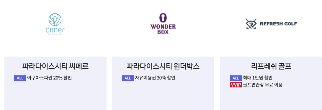 파라다이스씨디 씨메르와 원더박스도 등급에 상관없이 스파 및 자유이용권 20% 할인혜택이 있습니다.