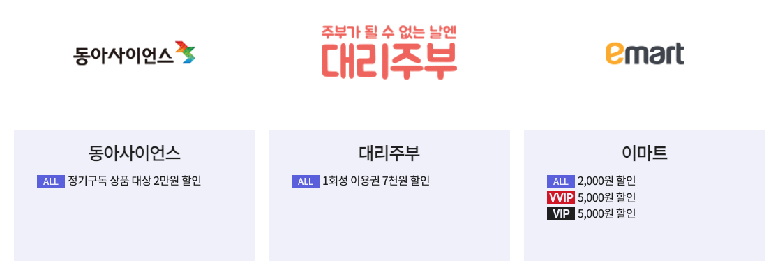 VIP는 월 최대 1회, 연 최대 6회 제휴사 중에 하나를 선택해서 혜택 받을 수 있습니다.