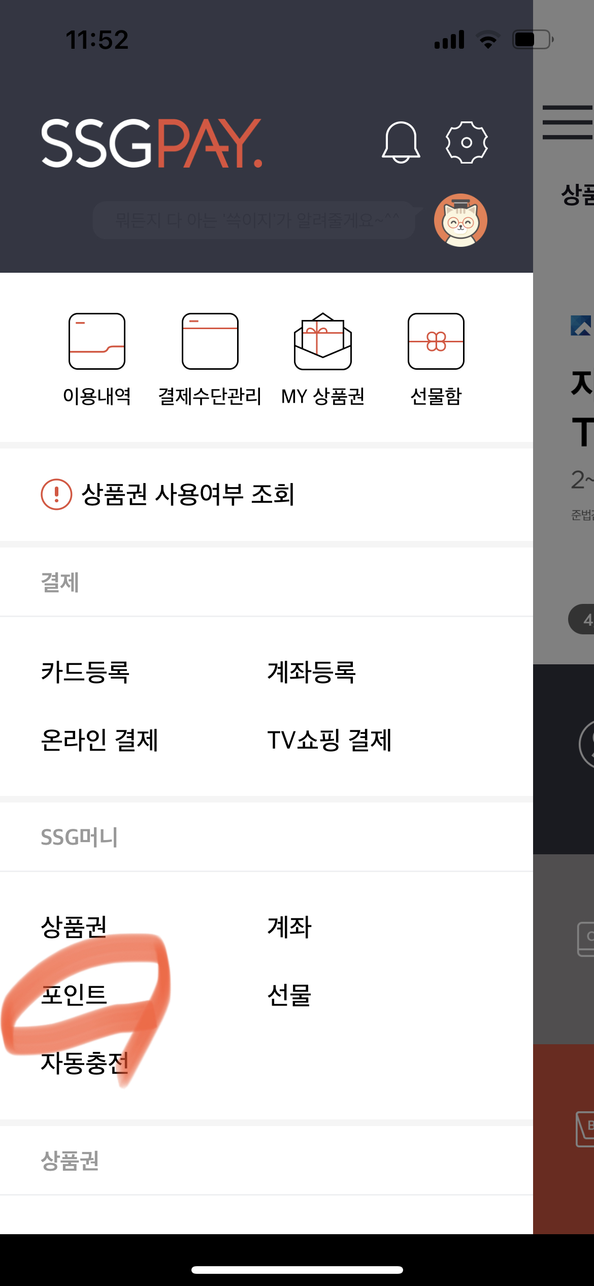 우선 SSG페이 어플을 설치하시고 실행을 하면 화면 맨 아래에 상품권 간편 기능이 보이실 겁니다.