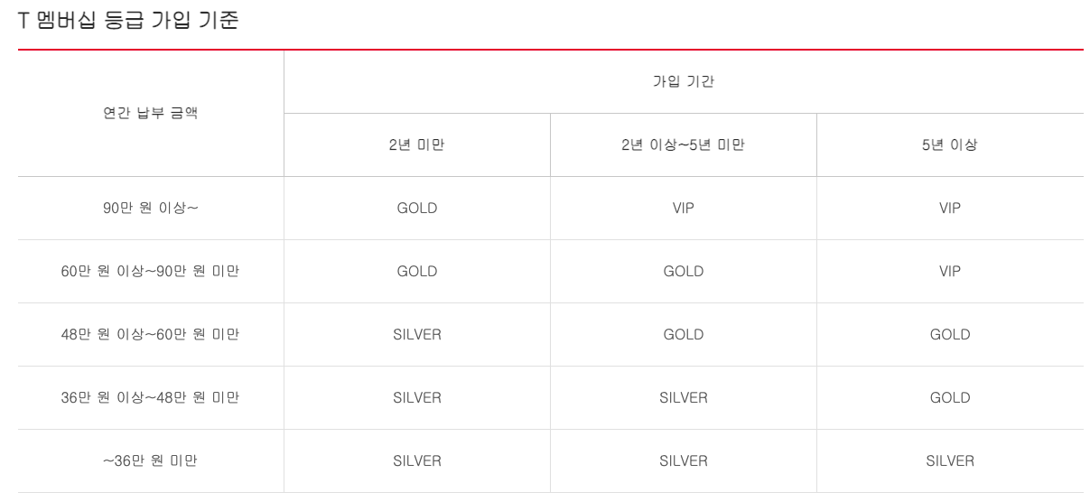 SKT는 요금제와 함께 사용 기간도 고려하여 T멤버십 등급을 나눕니다.