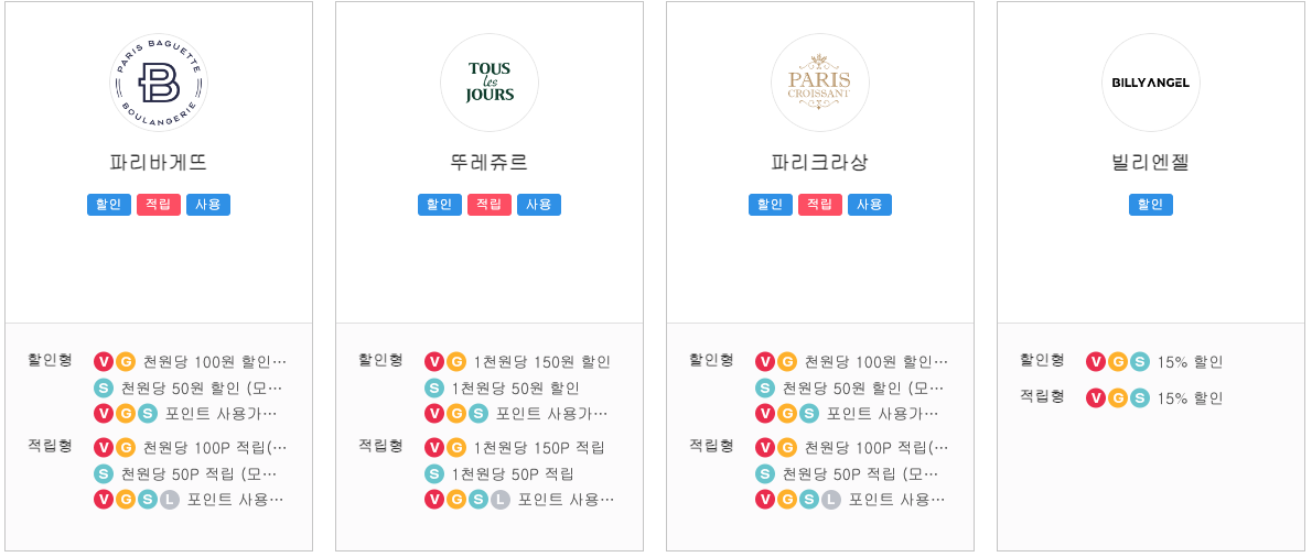 파리바게트의 경우 VIP / GOLD는 천원 당 100원 할인 및 적립되고