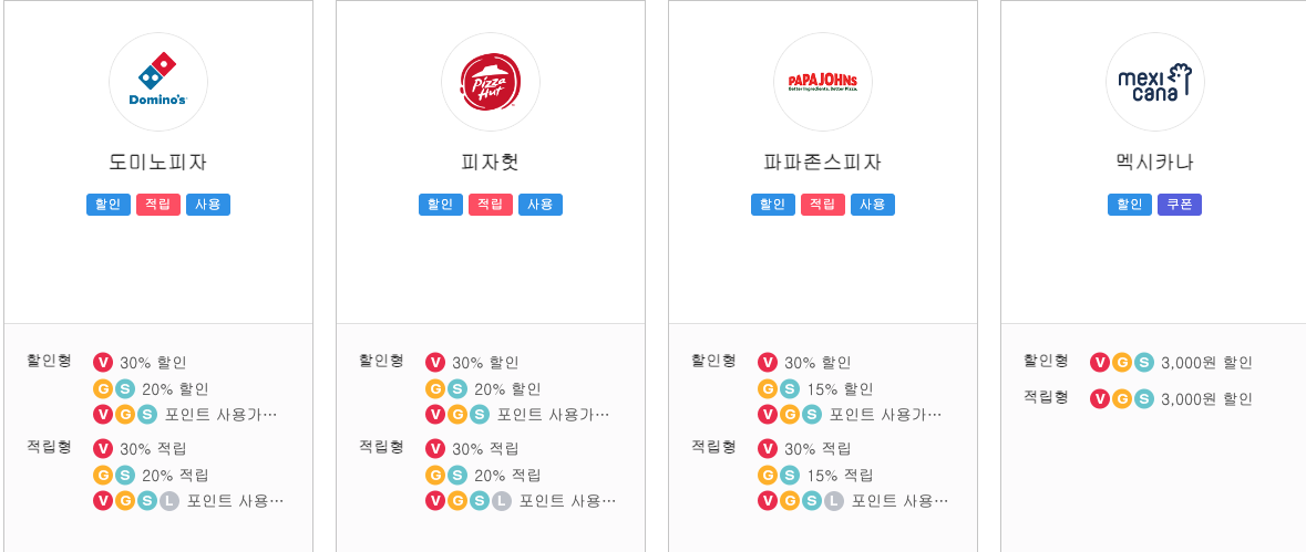 도미노피자, 피자헛, 파파존스에서는 최대 30% 할인 적립할 수 있습니다.